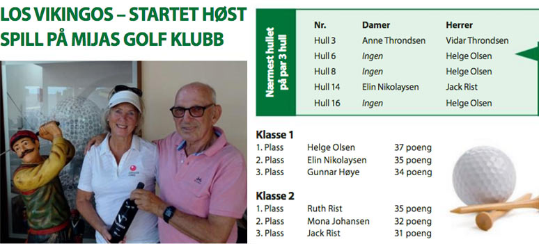 Los Vikingos er en golf klubb for nordmenn på Solkysten og spiller turneringer hver 14 dag på forskjellige baner på Costa del Sol. Høst sesongen startet 22. september 2019 med spill på Mijas Golf klubb hvor vi spilte Los Olivos banen som er en av to 18 hulls baner på Mijas. I strålende solskinn med […]