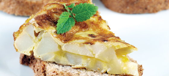 På tapasbarens meny finnes denne gangen også den alltid populære og allesteds nærværende spanske omeletten, tortilla española. Vi bringer i denne barens ånd den klassiske versjonen, men man kan utmerket godt eksperimentere ved å inkludere forskjellige urter, spinat, o.l.
