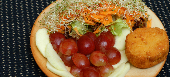 Et øyeblikk senere satt jeg med en innbydende salat, min bekjent med dagens suppe som var en potet- og purresuppe, og vi begge med et glass frisk gulrot- og mangojuice. Deretter prøvde vi fylte og gratinerte auberginer samt spagetti med hvitløk, chili, sjampinjonger, rosiner og pinjekjerner – en herlig pikant pastarett. Begge var virkelig velsmakende og mettende.