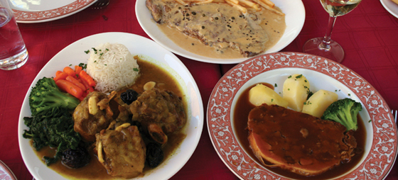 På menyen finner man alt fra couscous, tamara (torskerognssalat med persille og sitron), gratinerte auberginer med løk og koriander og fransk paté med akasier. Hva angår kjøttrettene, finner man lam med spisskomen, svisker, mandler og ris, samt fylt kylling med kastanjer, brokkoli og kokte poteter og sist, men ikke minst entrecôte med peppersaus.