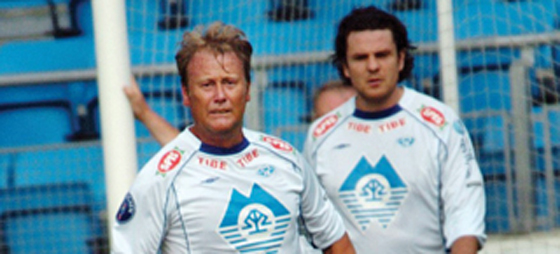 Drar du kjensel på disse FMK-spillerne? Tidligere landslagstrener Åge Hareide sammen med Flaco i en oppvisningskamp. Begge har spilt på A-laget til Molde. Foto: Romsdalen Budstikke