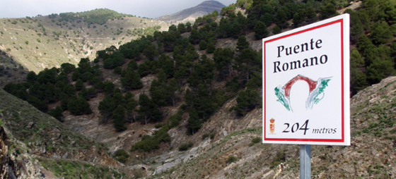 Sedella har ikke så mange severdigheter, så det betyr litt. I tillegg til kirketårnet er den eneste andre severdigheten et mudejar-tårn som tilhører et hus som ligger rett ved siden av kirken. Man kan se rester av mønstret murmaling på tårnet som altså stammer helt fra arabertiden. Huset er for øvrig til salgs, så hvis man gjerne vil bli den glade eieren av sitt eget mudejar-tårn, så kan det altså la seg gjøre. Vår tur starter på kirkeplassen, og når vi har beundret den, vender vi ryggen til kirken og følger gaten rundt til høyre på samme nivå. Gaten følger dalsidens konturer og på et tidspunkt kommer vi til et skilt på venstre hånd. Der står det: Puente romano 806 meter.