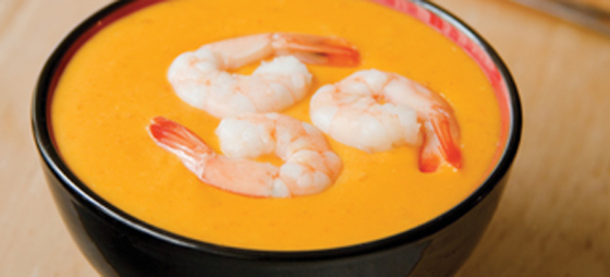 Porsjoner suppen i skåler med en skje hakket egg og fire kokte, kalde langostinos i hver. Pynt evt. med litt ferske krydderurter eller hakket chili, hvis du liker at det prikker litt på tungen.