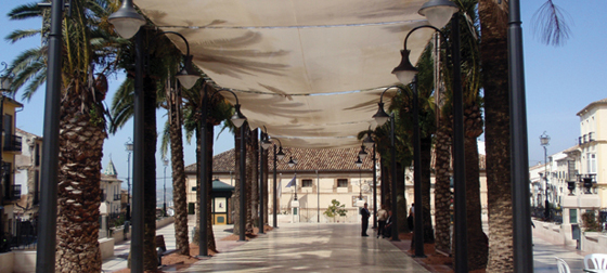 Den fine plassen med seil over. Ved enden ligger byens museum.