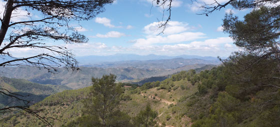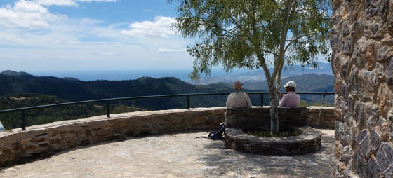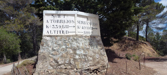 Etter besøket på museet går vi litt tilbake og opp stien der det står: Mirador del Palomar. Her går det oppover forbi miradoren og opp til en bred grusvei der vi dreier til høyre. Nå går det i rask gange rett fram i en knapp time der vi nyter fjelluften og den vakre utsikten over landskapet. På et tidspunkt kommer vi til et stort veikryss der en masse veier møtes. Midt i krysset ser vi en veiviser som ser ut som om den stammer fra Franco-tiden. Det gjør den muligens også, og faktisk er den gamle, opprinnelige skiltingen bevart i hele Montes de Málaga området.