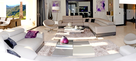 Alt er valgt ut med omhu. Spesialsydde gardiner, sengetepper og puter. Verker og skulpturer av spanske og utenlandske kunstnere, Eddy Parkiet, Ose del Sol, Kathrine Antanesian, Nimrod Messeg og Isis Kad pryder villaen med sine fargerike og sprelske motiver og gir liv til omgivelsene. Alt ned til minste detalj bærer preg av en profesjonelt, moderne touch fra Cecile Peyrard som sammen med sitt team av profesjonelle innredningsarkitekter har klart å skape et underverk. Kolleksjonen ”Contemporaneo” danner basis for hele innredningen som følger samme lyse, energigivende design som er villaens gjennomgående tema. Det samme gjelder de store terrassene som også er smakfullt dekorert av Roche Bobois med møbler fra firmaet Dedon.