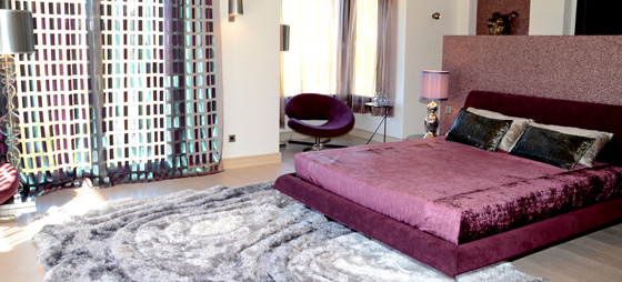 Master-soveværelse i grått og sølvtoner med tilbehør i blomsterfargede nyanser. Spesialproduserte gardiner og sengetepper, samt eksklusivt tilbehør fra Roche Bobois Contemporaneo-kolleksjon.