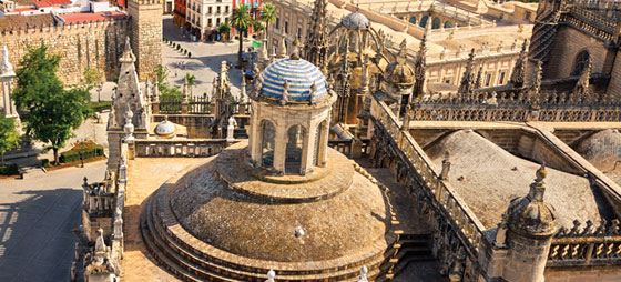 Mellom katedralen og Santa Cruz står det indiske arkivet, Archivo de Indias, som tidligere var markedshallen eller børsen, Casa Lonja de Mercadores, som Felipe II lot oppføre i 1572. Og så er det mauriske palasset Real Alcázar som fortsatt brukes av den spanske kongefamilien. Det er det eldste av sitt slag i Europa.