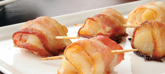 Pakk hver musling inn i et stykke bacon og sett en tannstikker gjennom. Stek dem i en tørr panne til baconet er sprøtt. En vidunderlig aperitiff eller som del av en enkel forrett. Bytt eventuelt baconet ut med jamón serrano.