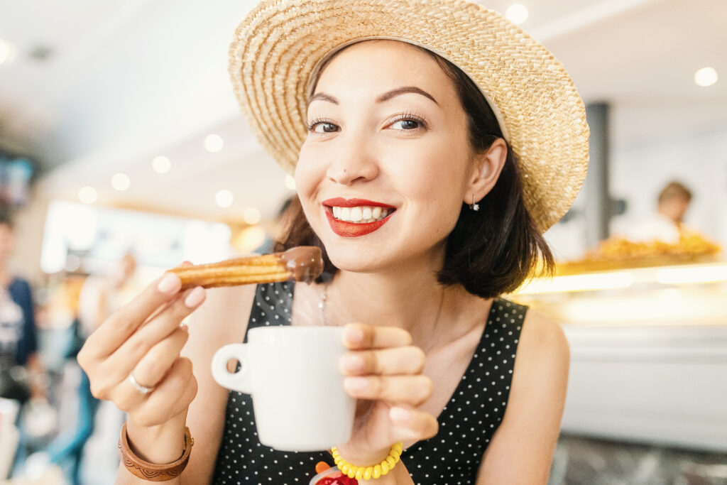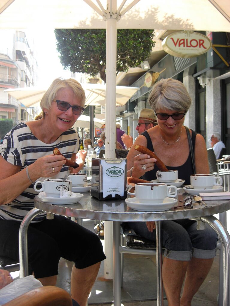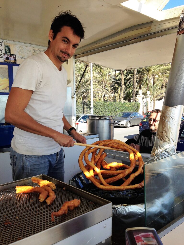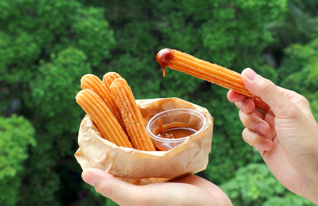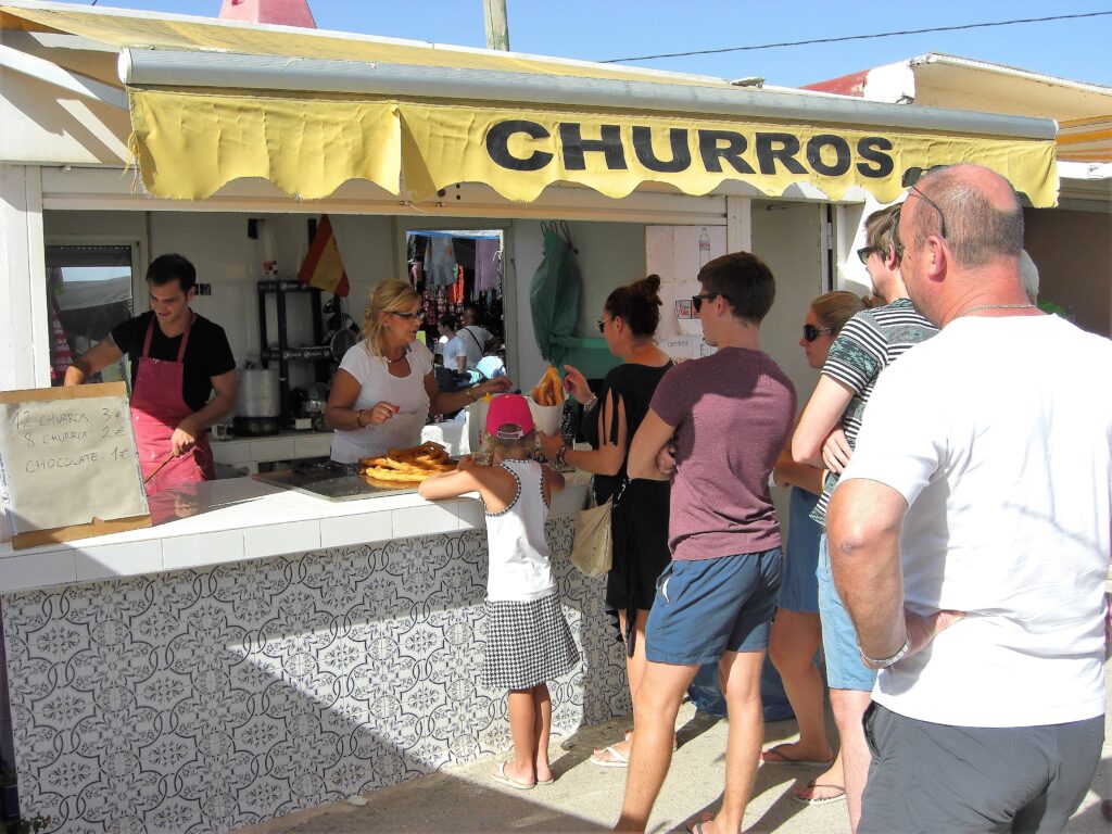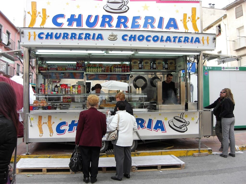 Ifølge sagnet ble forgjengeren til churroen skapt av en sulten gjeter rundt år 1000. Han laget en klump av gammelt brød, dyppet den i olje, stekte den på bålet og strødde sukker på – hvis en slik luksus var tilgjengelig. I dag nytes churros både til frokost og til la merienda, den hellige snacksstunden mellom lunsj og middag. De skal dyppes i sterk kaffe eller flytende sjokolade – ikke noe kakaoskvip! Her brukes ekte smeltet sjokolade, så tykk at en skje kan stå i den i tre sekunder før den begynner å helle