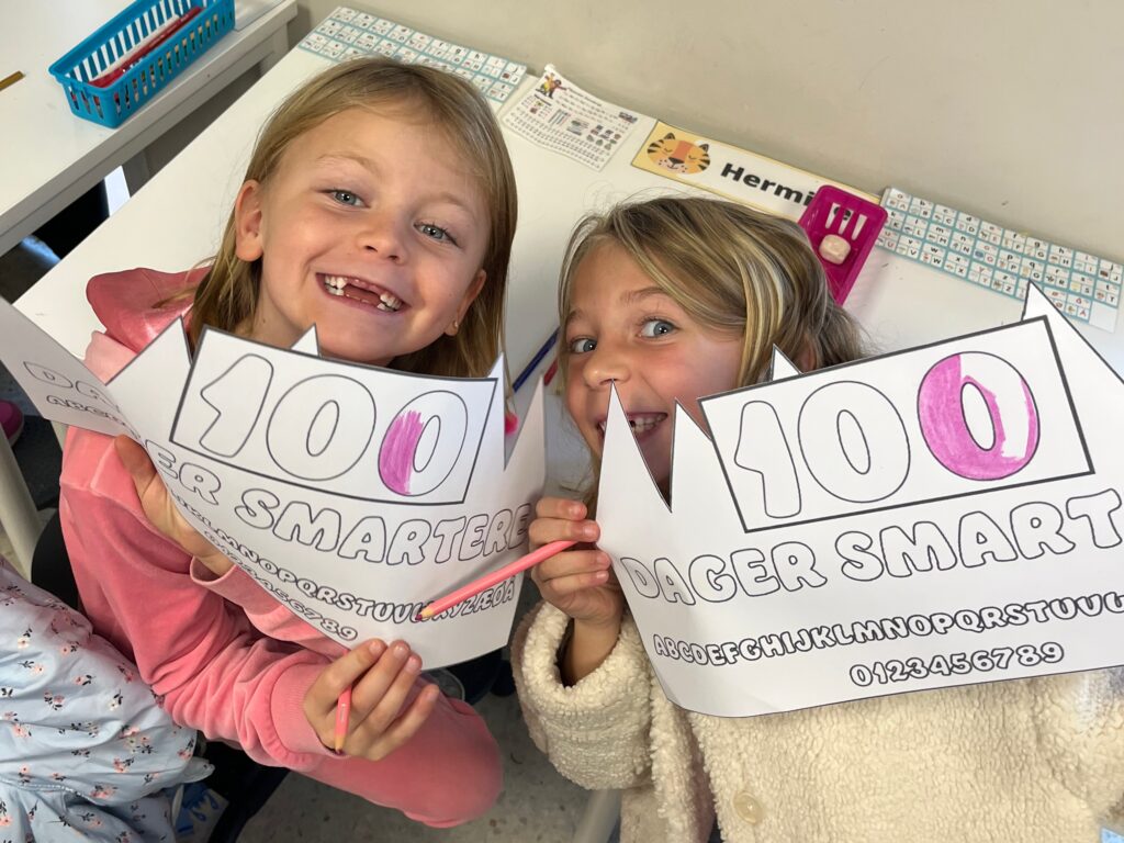 100-dager smartere er et opplegg levert av spireserien.no, og inneholder mange morsomme aktiviteter for nysgjerrige elever og lærere. Hermine og Angelina fargelegger egne kroner til feiringen.