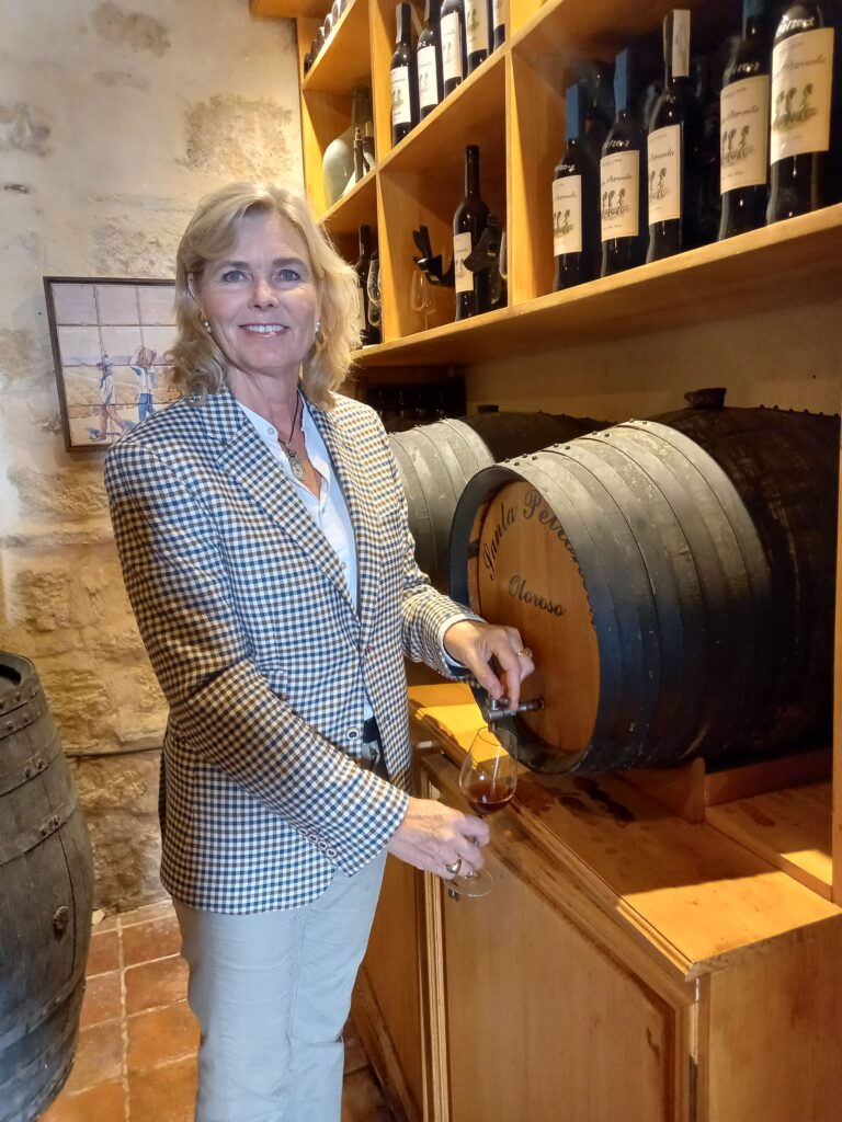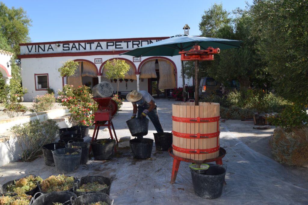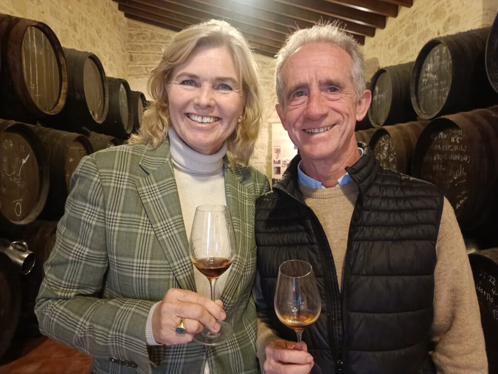 På en vakker desemberdag besøker vi gården Santa Petronila som ligger rundt 4 km utenfor Jerez i et bølgende landskap av vinranker så langt øyet kan se. Et sjeldent syn får vi høre senere, for drueproduksjonen har blitt halvert i de siste årene selv om distriktet har det beste jordsmonnet for denne type druedyrking. Det er lett å skjønne hvorfor det gjestfrie vertskapet falt for vingården, men det jeg vil vite, er hvordan en skipsingeniør og en økonom greide å bli prisvinnende vinmakere!