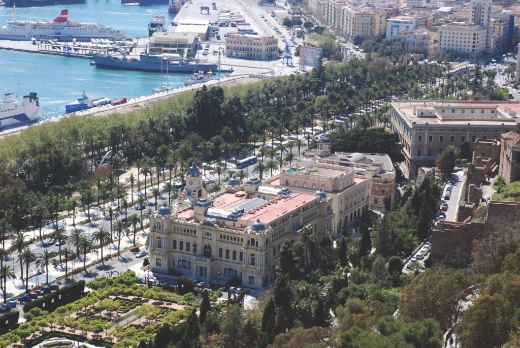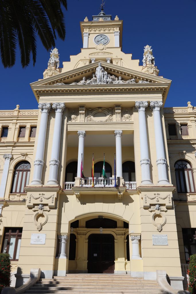 Glem moderne, minimalistiske kontorbygg – Málagas rådhus ligner en gigantisk bryllupskake, full av karakter og historie. El Ayuntamiento de Málaga ligger på Avenida Cervantes, parallelt med den vakre Paseo del Parque. Bak rådhuset ligger det romerske teatret, festningen Gibralfaro og Alcazaba, hvis murer bygningen nesten ser ut til å lene seg mot.