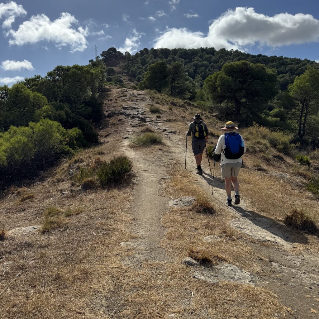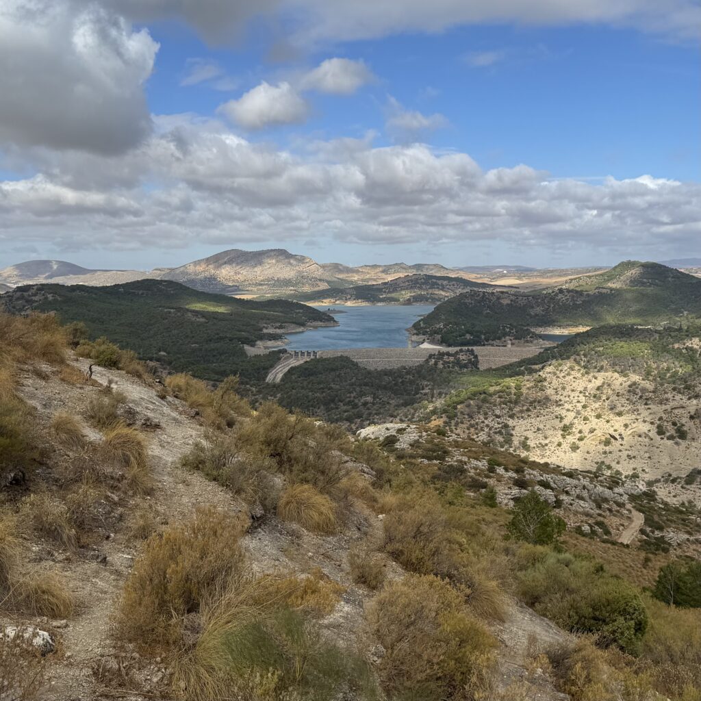 I passet åpner et helt nytt og uendelig vakkert landskap seg foran oss. Etter en kort strekning på flat sti kommer vi til en rampelignende formasjon på venstre side som vi må gå opp. Skråningene faller bratt ned på begge sider, men rampen er bred, så det er ingen risiko involvert. Stien fører oss opp til toppen av Pico de Almorchón, 663 meter over havet. Vi tar stigningen i rolig tempo, og når vi snur oss, har vi en flott utsikt over de mange embalses (vannreservoarene) som forsyner Málaga med drikkevann.