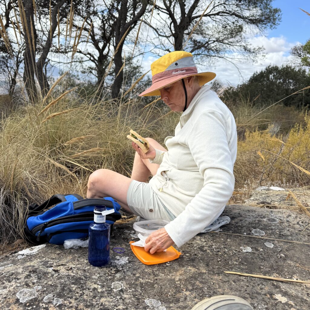 Vi tar stien til høyre og nyter en lang, rett strekning. Den fortsetter opp en åsrygg med bratte skråninger på begge sider, men ryggen er bred, og vi finner snart en stor, flat stein ( vår ‘Hard Rock Café’) der det passer å spise lunsj.