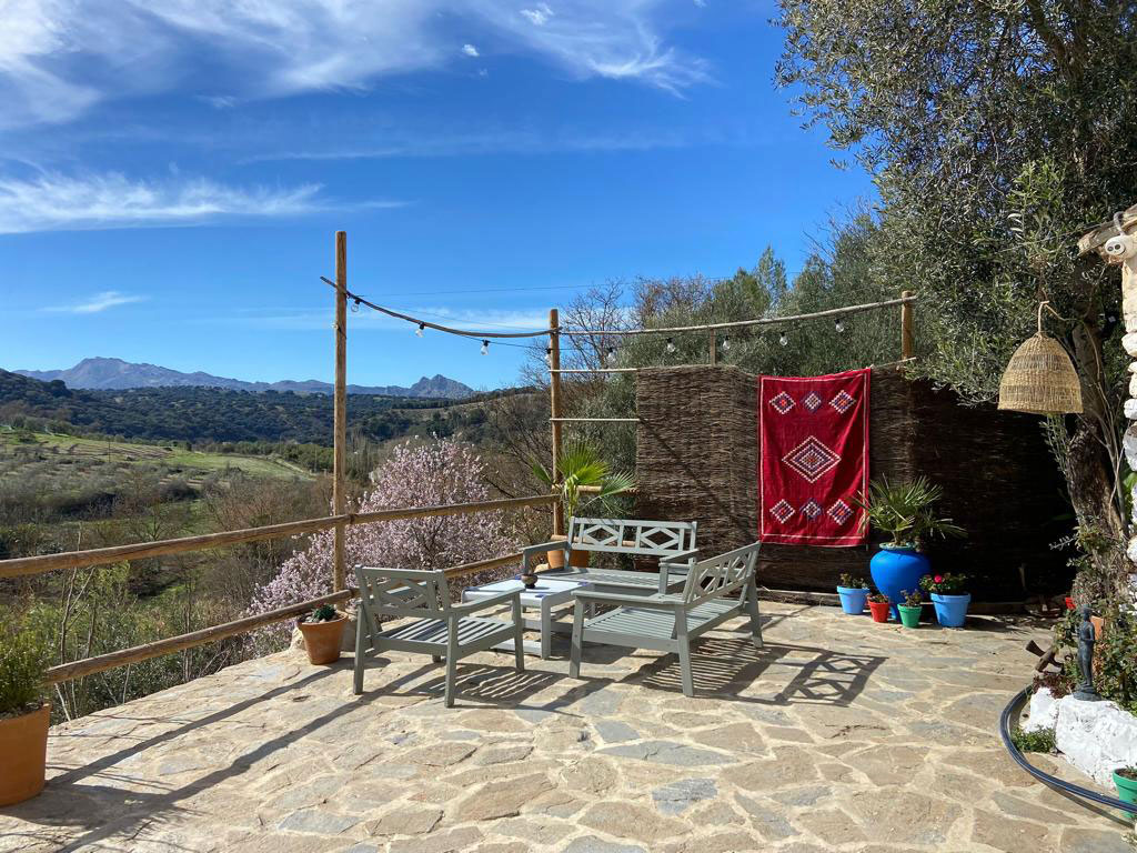 Vi setter oss ned og tar en prat på patioen med Ronda rett over oss og utsikt mot la Sierra.