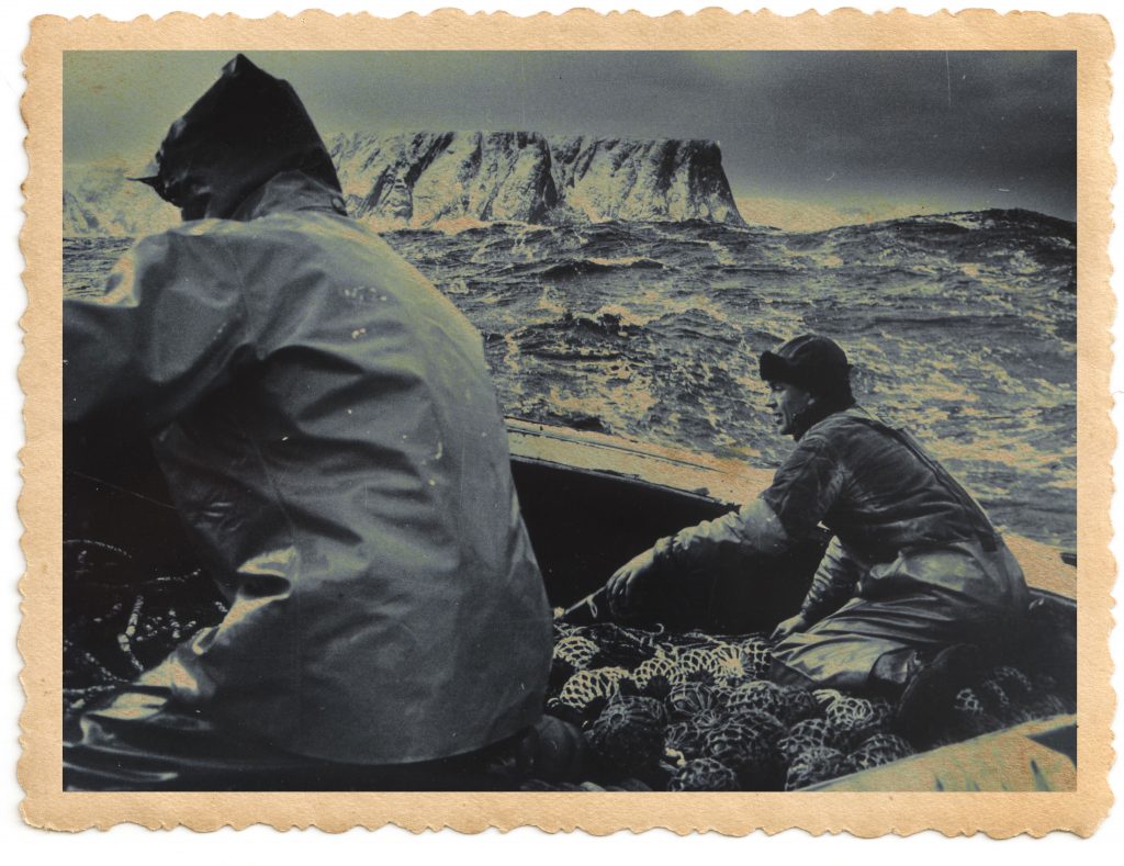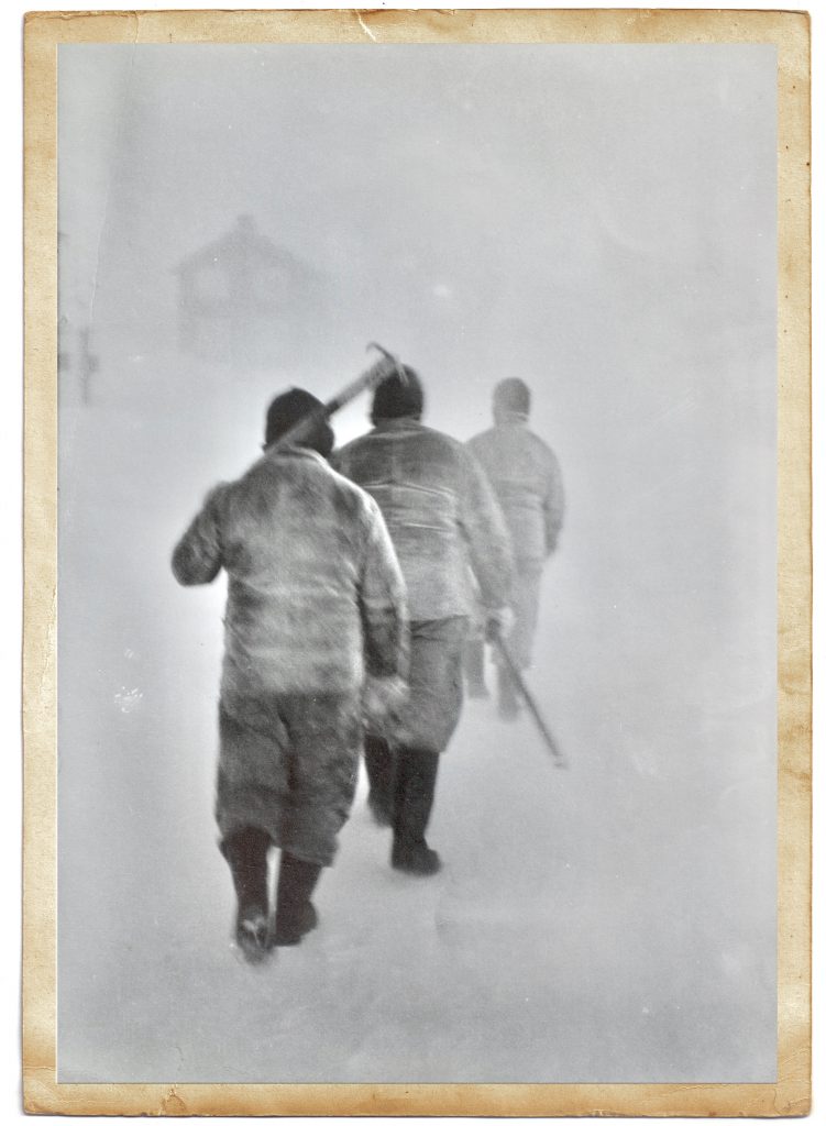 «I det andre året på på Fotoskolan fikk vi anledning til å gjøre større oppgaver. Først dro jeg et par ganger til Røros. Som avslutningsoppgave vinteren 1965 dro jeg til Nord-Norge midt i mørketiden. Hvor gæren var man ikke den gangen … Jeg hadde vært der én gang på sommeren og tenkte at dette kan jo kanskje være spennende. Jeg hadde ingen steder å bo og kjente ikke ett menneske der, men jeg dro nordover, tok lokalbåten fra Honningsvåg til Skarsvåg og måtte gå omkring og spørre folk om jeg fikk bo hos noen. Men det gikk jo greit. Det første bildet jeg tok der, av tre arbeidere som går inn i snøføyken, er ett av mine beste bilder.»