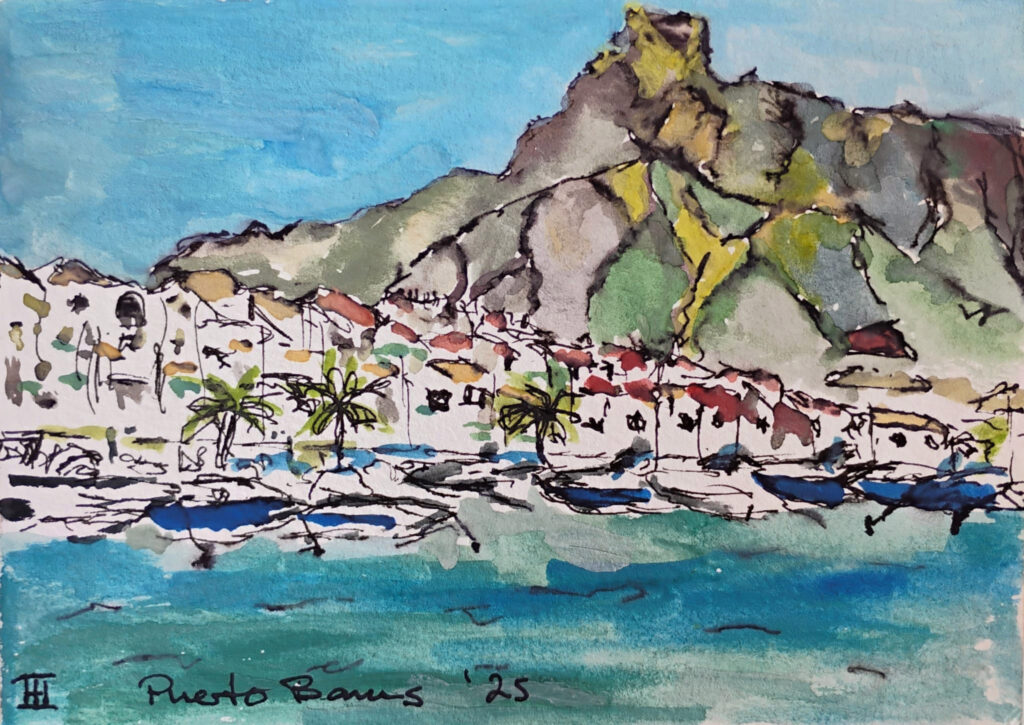 Sist Henriette var i Norge, hadde hun ikke med seg malesaker, så hun kjøpte en liten akvarellbok og et mini maleskrin. Dette har hun brukt flittig siden for sin akvarell portkortsamling – nok et prosjekt for den allsidige kunstneren.