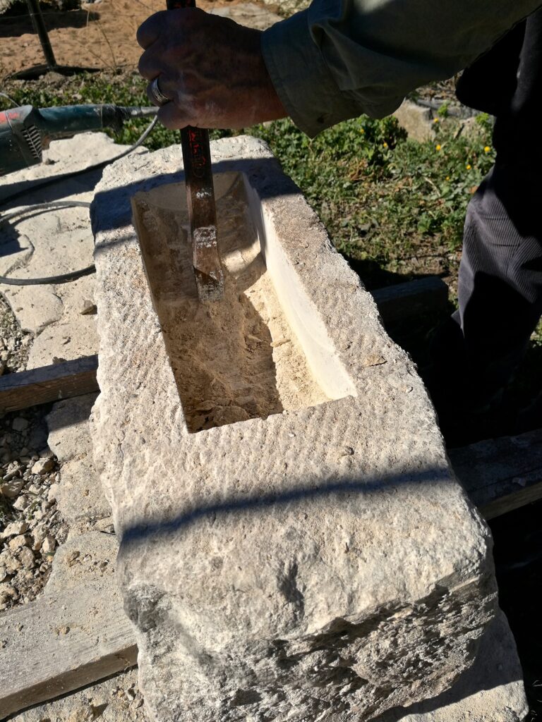 Å finne et gammelt steintrau til salgs, som i tillegg måtte passe inn på den begrensede plassen tilgjengelig på terrassen vår, viste seg å være helt umulig. Vi fortalte dette til vår venn Juan, som foreslo at vi dro til et nedlagt steinbrudd nær San Pedro-veien for å finne en stein og deretter hugge den ut selv. Siden vi ikke sier nei til en utfordring, ble vi med ham på en steinletingsekspedisjon noen dager senere. Som mange andre landlige virksomheter, måtte steinbruddet legge ned driften grunnet mangel på kunder. (De fleste foretrekker å kjøpe perfekte kuttede steiner i paller på Leroy Merlin) Her hadde vi et fjell av steiner å velge mellom. Man kunne gå seg vill i haugene, og dette var bare de forkastede steinrestene som hadde blitt slengt fra produksjonsområdet og ned den nærmeste åssiden.
