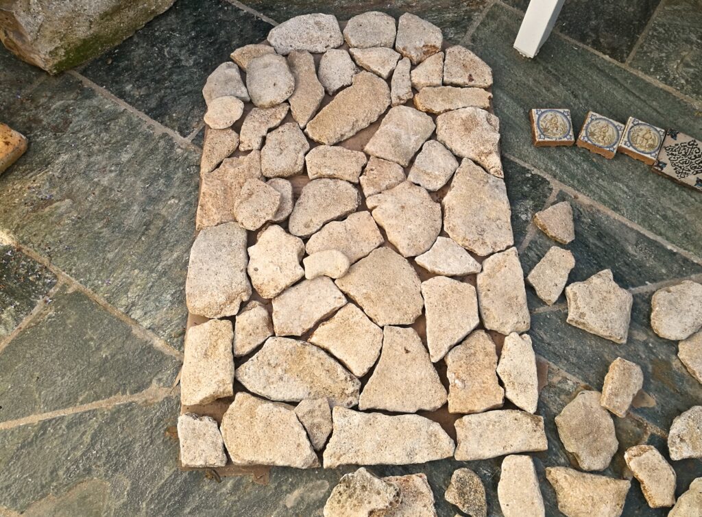 Så snart vi hadde fontenebasen på plass, begynte vi å lete etter steiner som ville passe som sprutplate. Dette var ikke noe problem siden vi bor på landet i Andalucía hvor hver eneste sti og jorde er dekket av steiner. Juan, som ikke kunne gjøre nok for andre, ga oss frie hender til å samle steiner på deres eiendom, slik at vi kom hjem med ti kilo hver i sekken – alle med sin egen personlighet og ofte avtrykk av fossiler. Da vi hadde mer enn nok råmateriale å velge fra, tegnet jeg bueformen jeg ville ha på et stykke kartong og la steinene inn som et puslespill på bakken (noen ganger er filmdesignkarriæren min hendig).