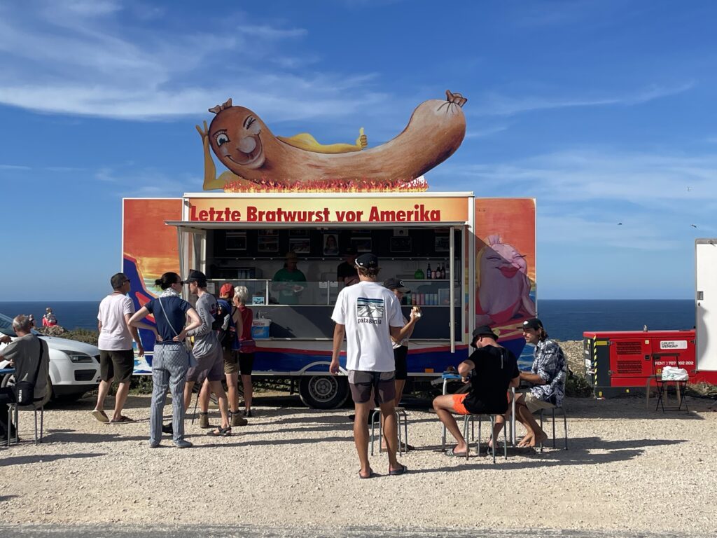 Da mangler vi bare å se Cabo de San Vicente som ligger 7 km fra fortet. Det ligger et viktig fyrtårn her, men man kan ikke gå inn på området, så vi må nøye oss med å inspisere de mange bodene som er satt opp utenfor, inkludert en pølsebod som annonserer på tysk at du kan kjøpe «den siste pølsen før Amerika». Det så ut til å fungere, for det var et godt med kunder.