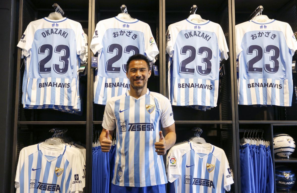 Bak Cristina, på den ene veggen i Málaga-butikken, er at hav av nye Málaga CF t-skjorter i nye kolleksjoner, som nå er på salg med rabatter på 30, 40 og 50 %. Det fikk meg til å tenke på den veggen for bare ett år siden, da den japanske stjerneforward og berømte ex-landslagsspiller Shinji Okazaki tegnet en 1-årig kontrakt med Málaga CF på en fri transfer fra engelske Leicester City.