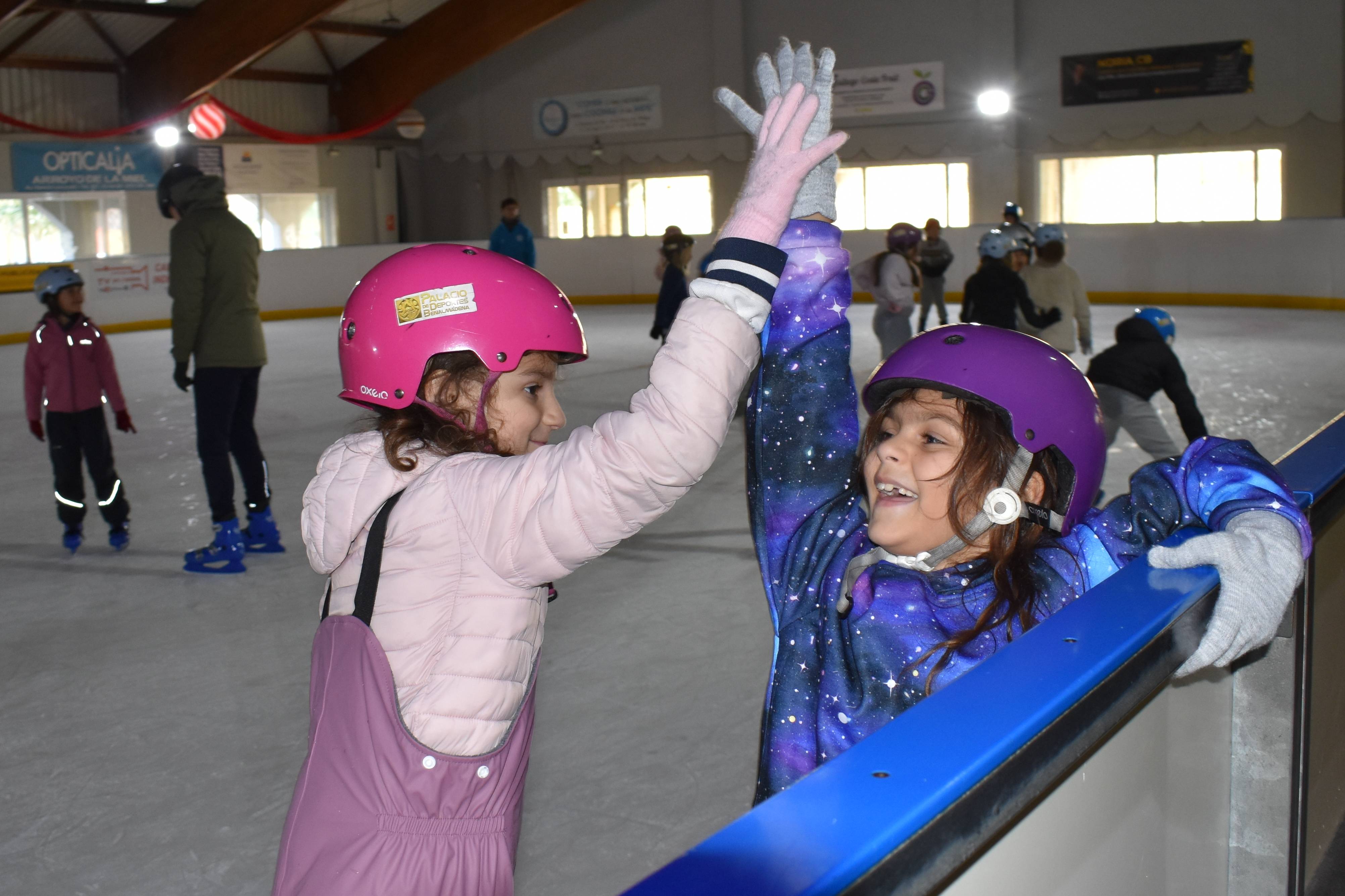 Veronica og Lena på 2. trinn tar en high five. Begge startet litt vaklende og usikkert, men fikk etter hvert taket på skøytingen.