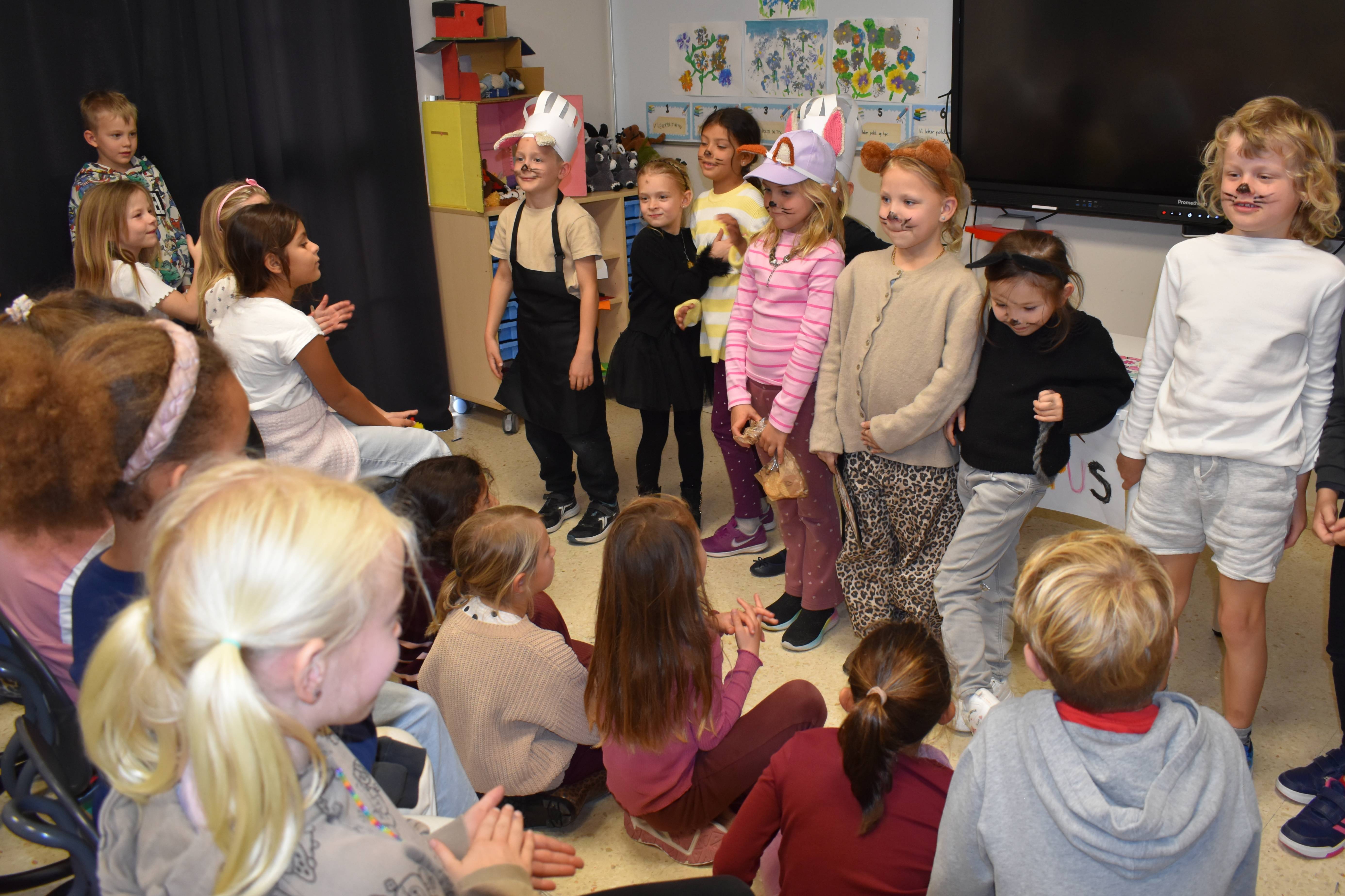Førstetrinnet er ikke bare flinke til å telle. De er også veldig flinke til å lære tekst utenat, synge og spille skuespill. Uka etter 100-dagers-feiringen fremførte de flere scener fra Torbjørn Egners bok Hakkebakkeskogen.