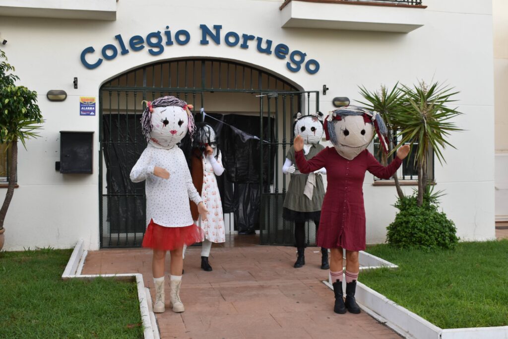 Vi tror dette må ha vært den skumleste Halloween-markeringen vi noen gang har hatt her på Costa del Sol! Da elevene kom på den siste fredagen i oktober, var det kanskje noen som syntes det var litt uhyggelig … For i porten sto det fire rare dukker med store hoder og tomme blikk. Heldigvis var det bare ledelsen som hadde kledd seg ut. Innenfor portene fikk man møte mange slags store og små skapninger – skumle, fargerike og kreative – både ‘døde’ og levende.