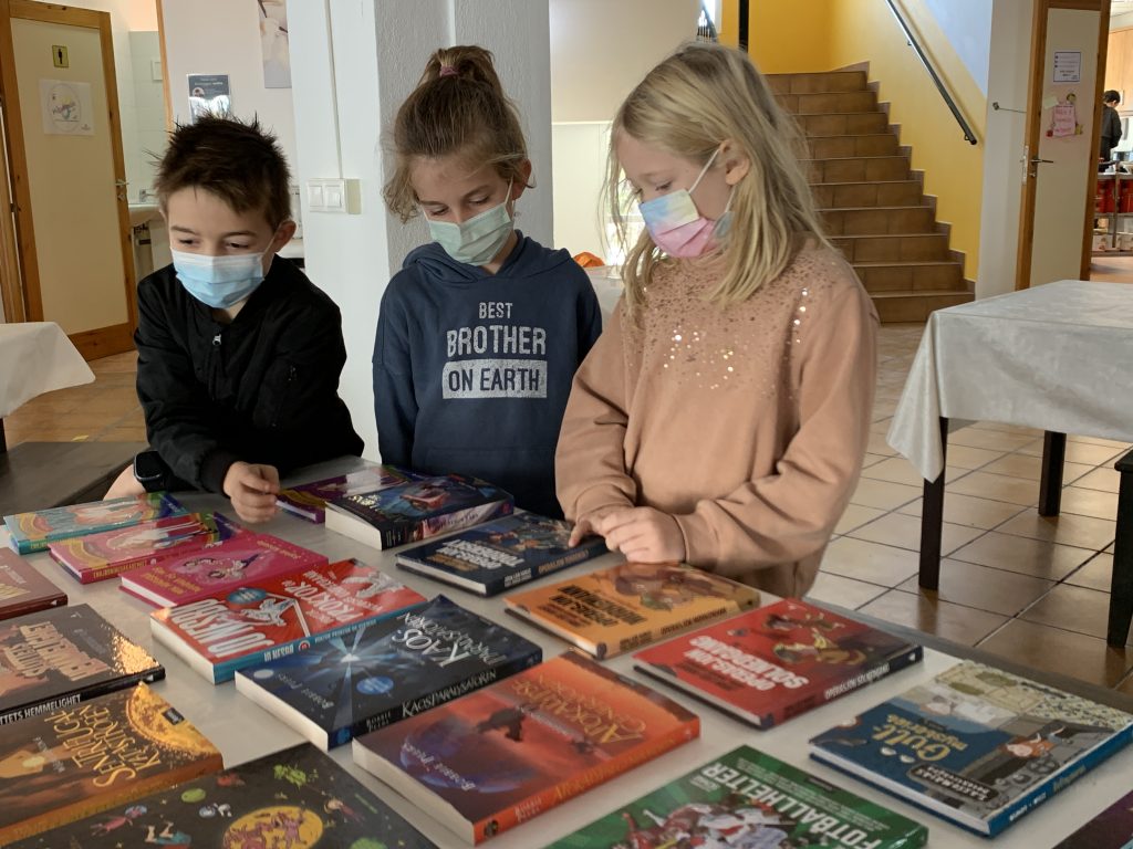 Keanu, Nassim og Ida ser igjennom de nye bøkene skolen kar kjøpt inn, og synes det er vanskelig å bare velge én bok av gangen.
