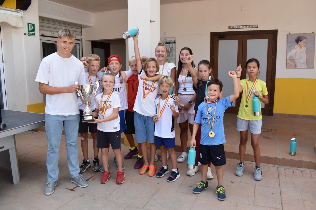 Her er alle vinnerne av Ørnemarsjen høsten 2022: De som holder i Vandrepokalen er skolens raskeste gutt, Oscar Wesøe, og skolens raskeste jente, Ella Sofie Taxt-Bassant.