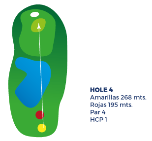 Som eksempel på noen hull, kan nevnes hull 4 som er et par 4 hull på 268 meter fra gul tee og 195 meter fra rød tee. Ikke la deg lure av distansen, da utslaget fra både gul og rød tee går over vann. Fra gul tee bør man slå rundt 150 meter for å komme seg trygt over vannet. Fairwayen er ganske bred, men det er elv på høyre siden og vei på venstre side. Kommer man seg greit over vannet, er birdie eller par fult oppnåelig.