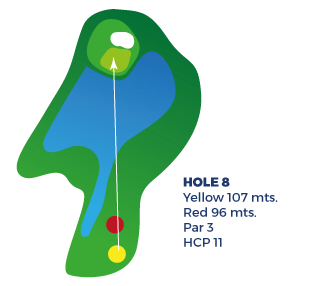 Hull 8 er et nydelig lite par 3 hull på 107 meter fra gul tee og 96 meter fra rød tee. Her må man heller ikke la seg lure av distansen, da greenen er omringet av vann, så man slår over vannet for å nå greenen. Selve greenen er ganske stor, men forholdsvis rask. Her er det mange som lander på greenen, men ballen ruller rett over, og man er dermed i vansker.