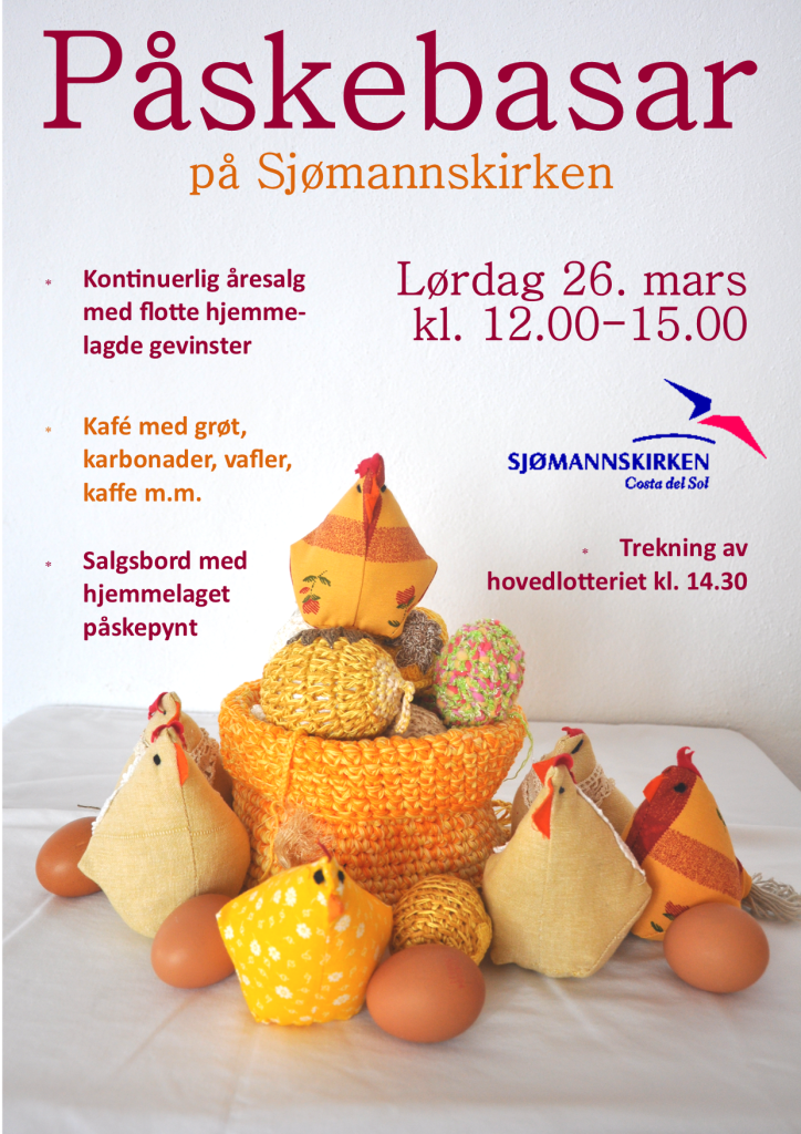 Velkommen til årets påskebasar lørdag 26. mars kl. 12–15! Her kan du kose deg med deilige karbonader, grøt, gode vafler og godt selskap. Det blir kontinuerlig salg av lodd med flotte premier, og du kan handle håndarbeid av god kvalitet.