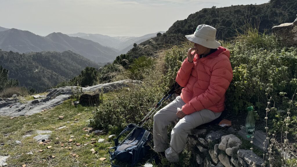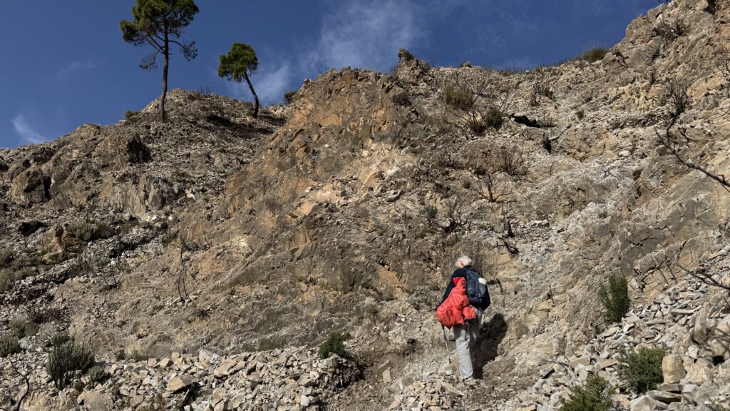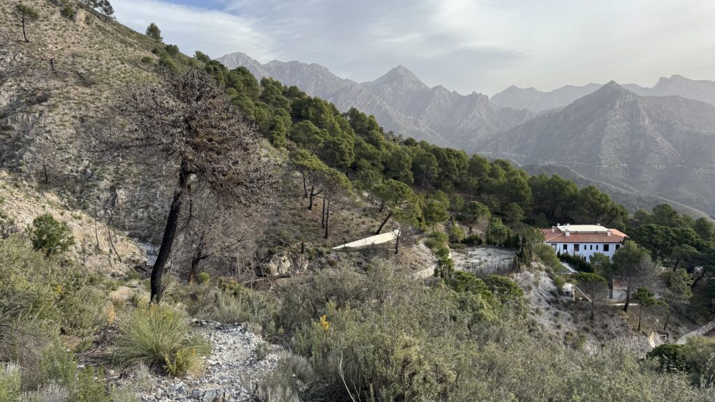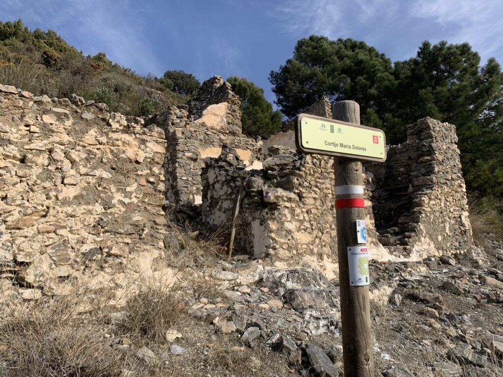 Herifra kan man i klart vær se de imponerende Rif-fjellene i Marokko. Man ser også en del skilt med GR 249 – Gran Senda de Málaga, og det er disse skiltene vi følger i østlig retning. Det betyr at vi tar til høyre når vi kommer opp på toppen og følger en grusvei. Veien klatrer til den kommer til et lite pass, og derfra går den nedover mot et punkt hvor en sti til ruinen Cortijo María Dolores svinger av til høyre, men vi følger fremdeles skiltene til GR 249.
