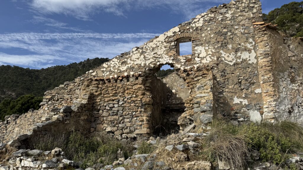 Før det ble bygget ordentlige veier, var denne stien ‘hovedveien’ mellom Nerja – Frigiliana – Cómpeta og videre nordover. Det synes jeg er interessant, for det er vanskelig å forestille seg i dag hvordan det var for bare 100 år siden å ferdes i disse fjellene og bringe varer til bygdene. Varene ble fraktet på ryggen av muldyr med en mann eller kvinne som førte dyret. Muldyrene kan bære mye mer enn hester, så de var det foretrukne trekkdyret. Deres maksimale kapasitet var 60 kg. 30 kg på hver side, godt balansert. Dyrets fører heter arriero på spansk og disse tøffingene bodde med dyrene sine og var helt avhengige av dem for å overleve. De overnattet og spiste i et vertshus, slik at de ikke ble angrepet av landeveisrøvere, så det var helt sikkert ikke et lett liv. El Pradillos, der vi nå står, var en slik venta hvor folk og dyr kunne spise og sove. Det var et ganske stort sted med en rund treskeplass (era), så de må ha dyrket korn i nærheten.