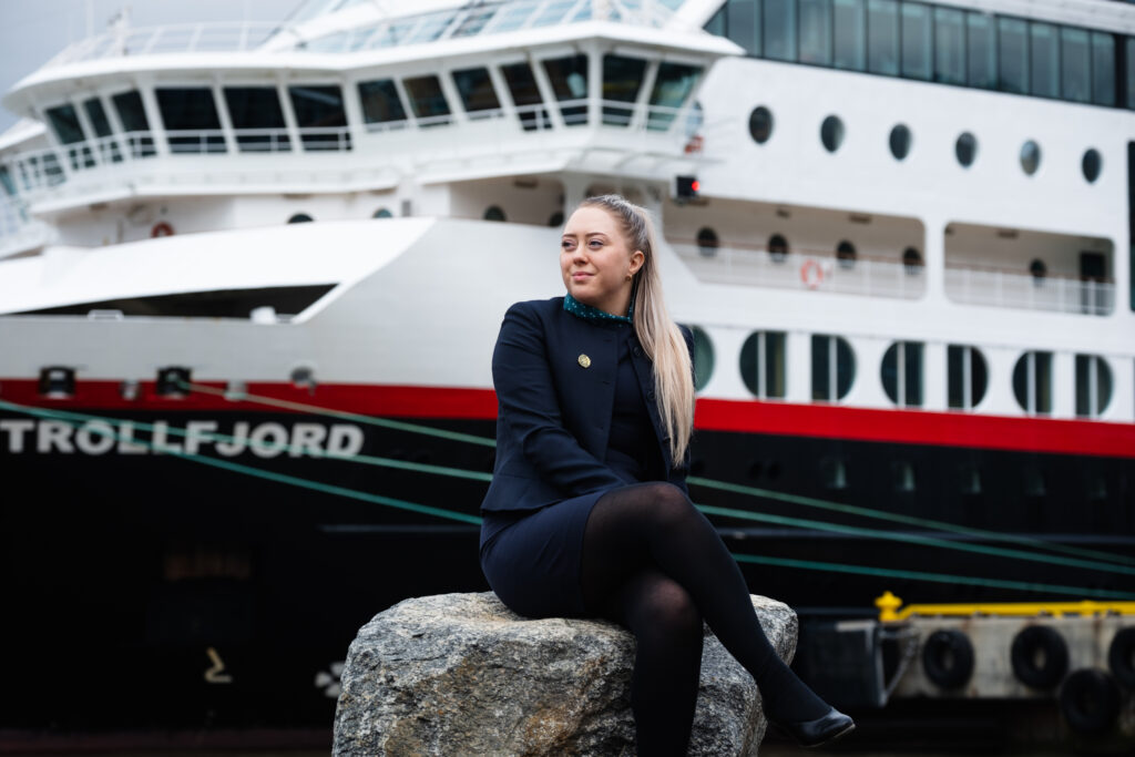 -Som alle venna mine, søkte jeg på helsefag, men jeg visste egentlig ikke hva jeg ville bli. Jeg tok et par friår hvor jeg blant annet jobba i en klesbutikk og på bar. Seinere tok jeg reiselivslinja, og da læreren min spurte om jeg ville være utplassert på Hurtigruta, svarte jeg «Koffor ikke!» Den første natta ombord blei jeg skikkelig sjøsyk selv om det var helt blikkstille. Kroppen min var ikke vant til å være på båt, så jeg lå og kasta opp heile natta og tenkte at herregud hvordan skal jeg klare dette her! Men man må jo bare stå på, og så får man jo de herre sjøbeina etter hvert, da.