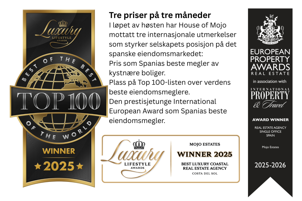 Mojo Estates, med base mellom Málaga og Marbella på Costa del Sol, har offisielt blitt tildelt tittelen Spanias beste eiendomsmegler. Det danskeide selskapet, grunnlagt av Mette og Per Mønsted samt Jacob Johansen, mottok prisen under International Property Awards i London – en utmerkelse som sementerer Mojos posisjon som en av de mest innovative og pålitelige aktørene på det sørspanske eiendomsmarkedet.