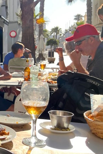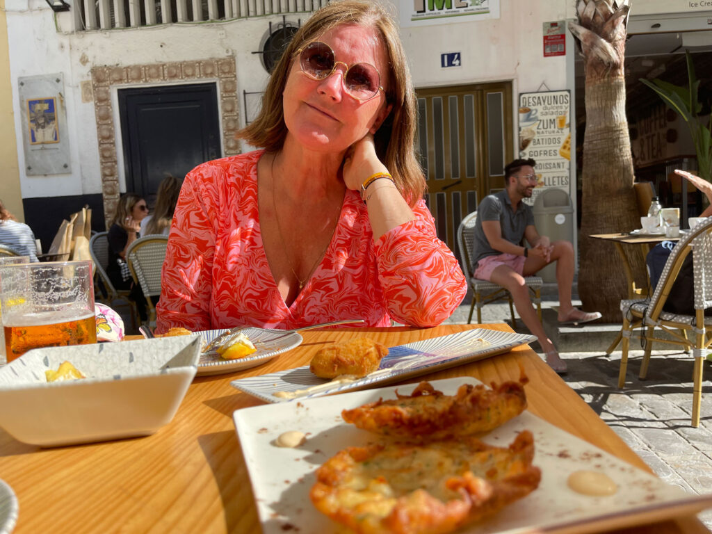 Vi sitter ute i den lille sidegata Calle Félix på enkle stoler ved hvitmalte bord, litt solbrent etter noen timer på La Caleta, den populære stranda rett utenfor gamlebyen. Rundt oss summer det av høylytt prat, latter og barn som leker og roper. Mange av gjestene snakker spansk, og vi antar de fleste er lokale, ofte et godt tegn når du skal velge spisested i Spania.