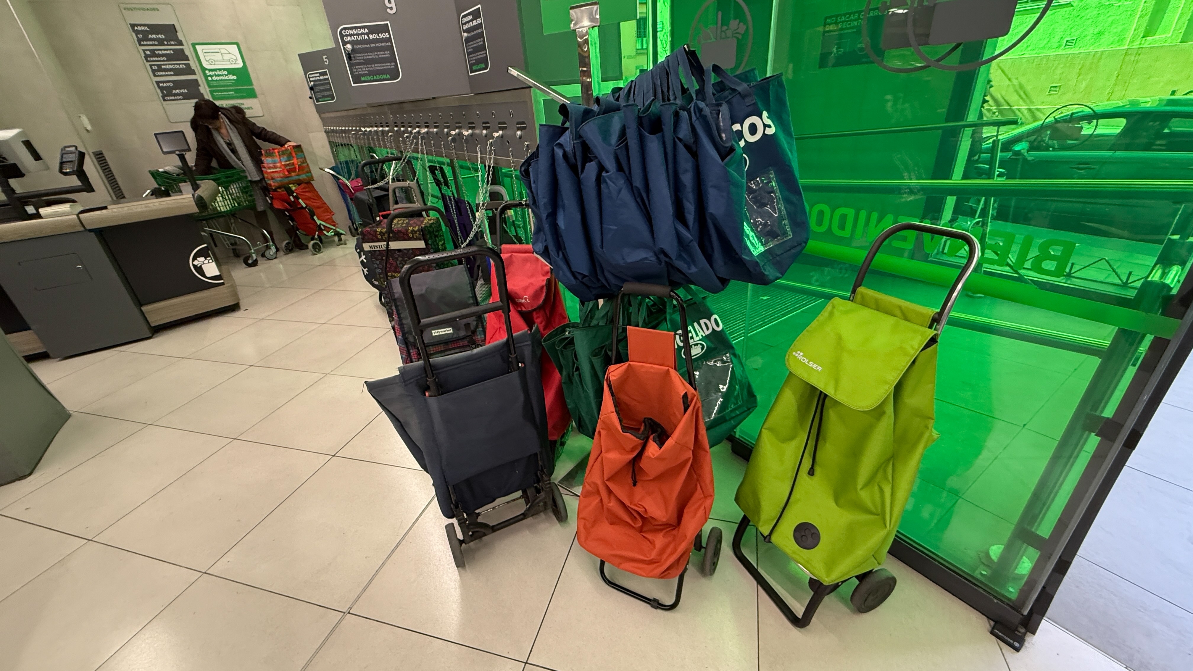 Hvis du går til en matbutikk i Spania om morgenen, spesielt når de spanske husmødrene er ute og handler, vil du oppdage noe som ennå ikke har fanget det store flertallet av dagligvarekunder i Skandinavia. I tillegg til at folk liker å sosialisere med kassadamen når det er på tide å betale, noe som ofte fører til lange køer, vil du se et hav av trillevogner i alle farger, modeller og kvaliteter. Mange butikker har også dedikerte steder utenfor kassaområdet hvor trillevogner kan oppbevares og låses mens man er inne i butikken, slik at man enkelt kan hente dem igjen når man skal rulle varene hjem. Det er lurt å låse trillevognen, spesielt hvis den er moderne og dyr. Forresten er det ikke bare kvinner som bruker disse vognene. Folk i alle aldre, til og med tenåringer, har tatt i bruk denne enkle måten å bringe varene hjem.
